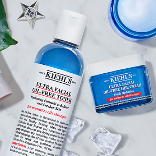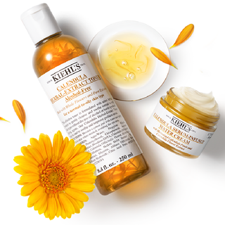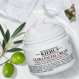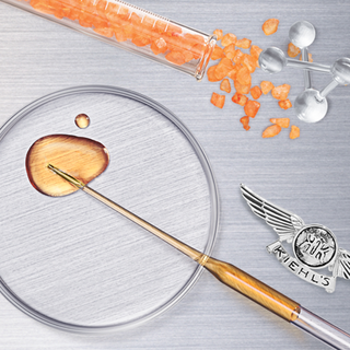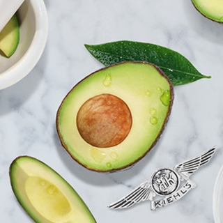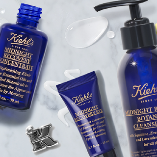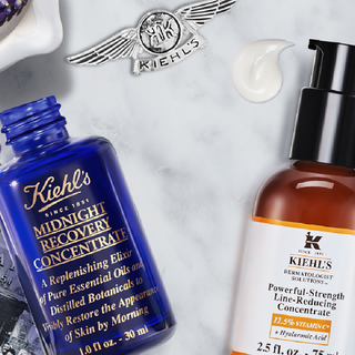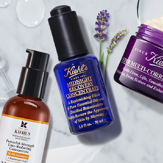 A marble background featuring a vintage black-and-white photo of Kiehl's pharmacy staff, along with lavender, olives, and decorative elements, emphasizing Kiehl's history as a New York apothecary since 1851.